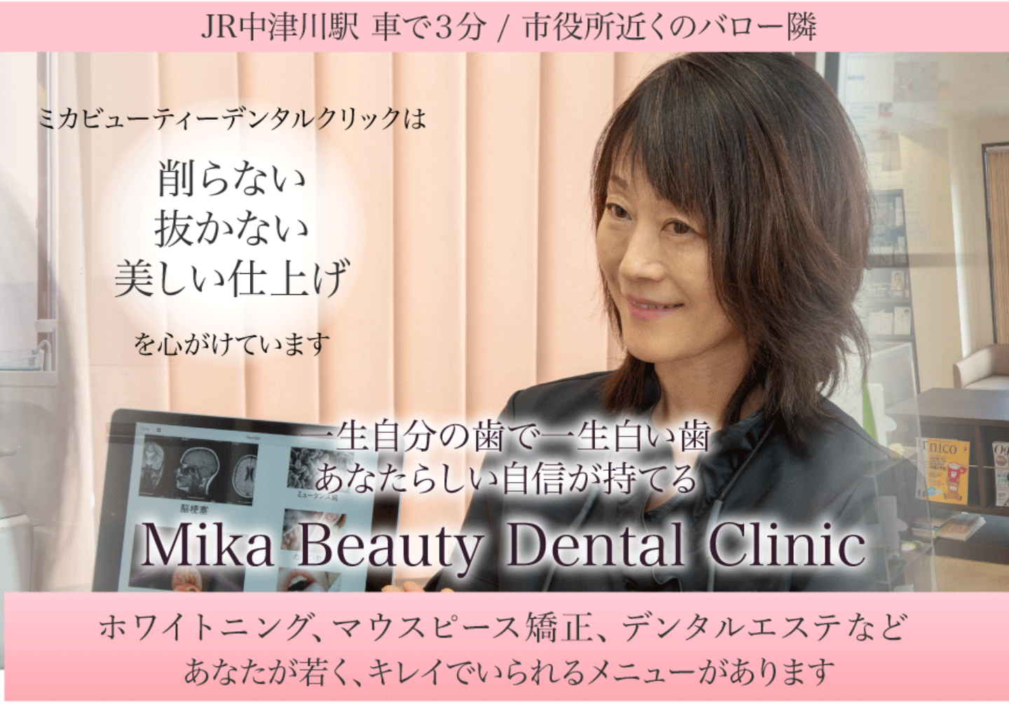 JR中津川駅から車で2分(徒歩で約15分)の市役所にほど近い場所に位置し、スーパーのバローの隣にある歯科医院が「Mika Beauty Dental Clinic」です。