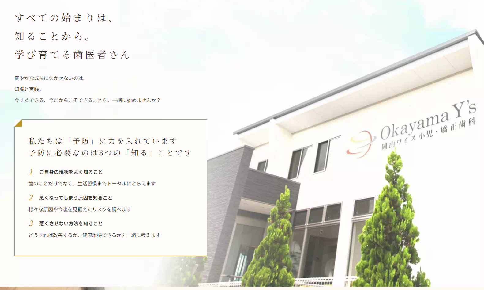 岡山ワイズ小児・矯正歯科は、大元駅 東口から車で14分の場所にあります。「ワイズ」という名前に込められた「堅実な」「方向づける」という意味を理念とし、子どもたちの未来を良い方向へ導くことを目指しています。単なる症状対処ではなく原因から正すアプローチを取り、しっかりとした診査・診断を行い、その結果を子どもにも分かりやすく説明して自己健康管理を促すことです。