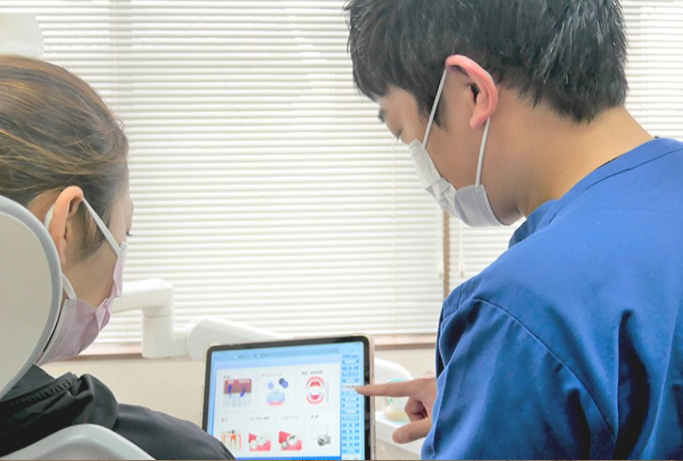 患者様一人ひとりのお話をしっかり聞くため、診療時間を十分に確保したうえで、検査や治療についてわかりやすく説明してくれます。また、歯科治療のことがよくわかる3Dアニメを観ることで、自分で見ることのできないお口の中の「治療の流れ」を事前に把握できるような工夫も施されています。