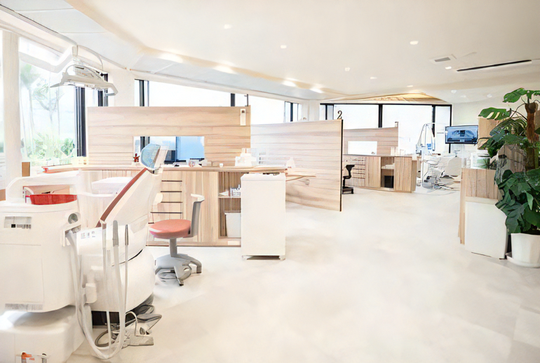 峰歯科・矯正歯科クリニックは、伊賀線西大手駅から徒歩2分、崇廣中学校の隣に位置しています。院内はホテルのような高級感を意識した広々としたデザインが特徴で、アロマテラピーや心地よいBGM、座り心地の良い椅子が配されており、待ち時間も快適に過ごせる環境が整えられています。