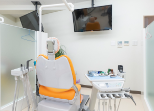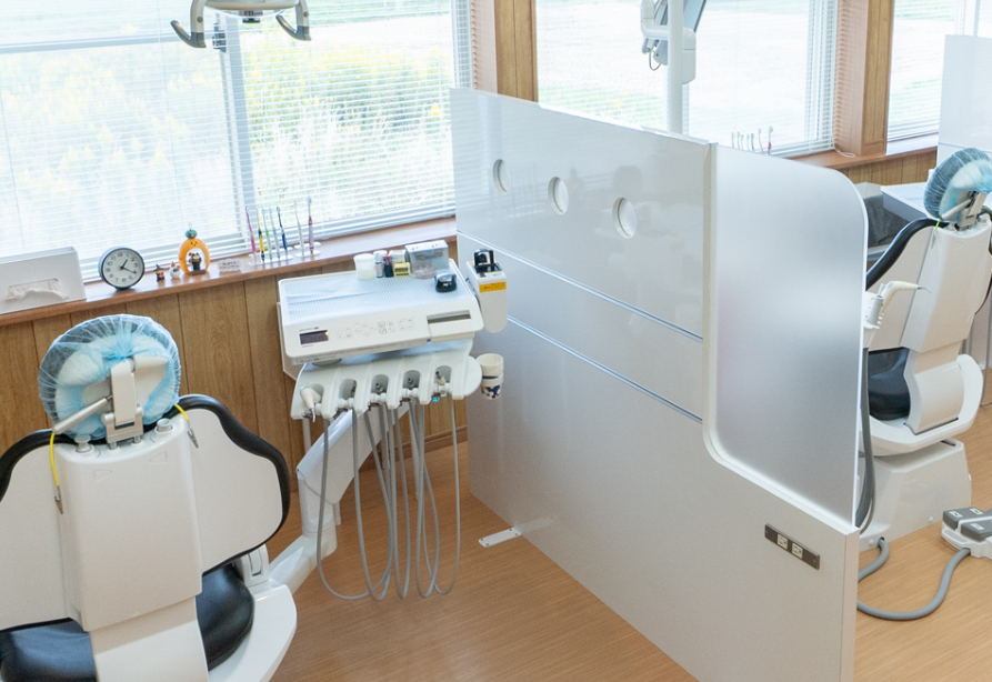 院内の特徴的な設備としては、修復物を1時間程度で作製できる「セレックシステム」、抜歯後の疼痛の緩和、口内炎、知覚過敏などに使用できる「レーザー機器」が挙げられます。東の窓から光が入り明るくなるよう設計された診療室は、清潔感と開放感にあふれています。診療台は、隣の方が気にならないようにスペースをしっかりと区切っており、プライベート空間を確保しています。