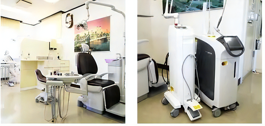 治療設備として、2台のレーザー装置を完備し、それぞれの特性に応じた治療を行っています。CO2レーザーは、抜歯や歯周外科治療後の止血や口内炎治療、痛みの緩和、知覚過敏の処置に使用され、治癒を促進します。一方、Er-YAGレーザーは、歯周治療や歯石除去、むし歯の切削、外科的処置に効果的です。