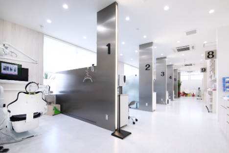 こちらのクリニックは、すべての診療室が個室の設計となっており、患者様が落ち着いて過ごせるほか、医師が集中して治療に取り組めるメリットもあります。また、それぞれの個室すべてに口腔外バキュームを設置して目に見えない空気中の粉じんも吸い取っており、衛生管理を徹底しています。正確な診断のための設備としては歯科用CTを導入しており、セカンドオピニオンにも対応可能です。