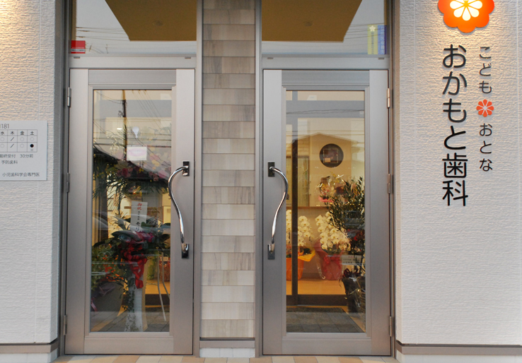 こども・おとな おかもと歯科は、バス「卸センター」停留所で下車して徒歩3分の場所に医院を構えています。駐車場は、医院の正面に11台分あり、車1台分の幅が通常より広くとられています。お子様をチャイルドシートに乗せたり降ろしたりする親御様にとって嬉しい環境です。