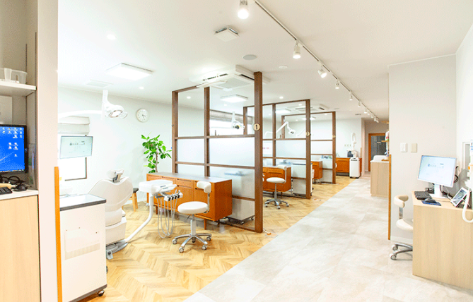 医院の待合室はまるでホテルのラウンジのような高級感のあるくつろげる空間となっており、患者様ごとの距離をしっかり確保できる1人掛けの椅子が置かれています。診療室は全て「個室」または「半個室」となっているため、他の患者様の目を気にすることなく、安心して治療を受けられる環境です。また、小児専用診療室も設けられているため、お子様でも快適に治療を受けられます。
