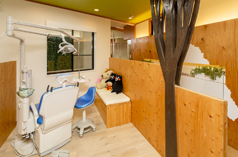診療室は、それぞれの目的から「キュア(治療)ゾーン」「ケア(予防)ゾーン」「小児歯科ゾーン」の3つに分け、幅広い歯科医療を提供できる環境を整えています。小児歯科ゾーンにはおもちゃやぬいぐるみが常備されているので、歯科治療が初めてのお子様の恐怖感を和らげることができるでしょう。また、天井にはテレビモニターが設置されており、好きなアニメを見ながら治療を受けられます。