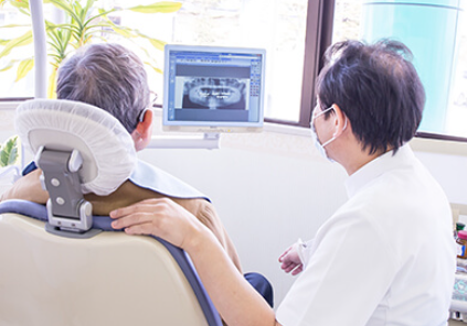 診療内容は、一般歯科、根管治療、歯周病治療、歯周組織再生療法、オーラルフレイル予防、摂食嚥下障害、小児歯科、矯正歯科、口腔外科、インプラント、入れ歯、予防歯科、審美歯科、顎関節症といった幅広い内容を提供しています。「未病の快寿」をモットーに、常に新しい機器や治療法、栄養指導などを導入し、患者様の充実した人生をサポートしています。そのために、初診の際にはしっかりと検査を行って、患者様が有しているリスクを明確にすることから始めます。歯や歯茎の状態だけでなく、栄養摂取状況もうかがっているのは大きな特徴といえるでしょう。