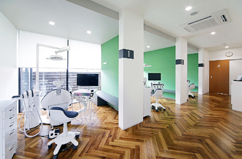 待合室にはキッズルームがあり、お子様連れの方も安心です。また、授乳やおむつ替えができるベビールームも設置されています。診療室には完全個室があり、キッズスペースも併設されているので、プライバシーを守りながら小さなお子様と一緒に治療を受けられる環境です。カウンセリングルームでは、治療計画の詳細な説明を受けられます。バリアフリー設計で、お年寄りの方や妊婦の方、車いすの方も安心して通院できる環境が整っている歯科医院です。