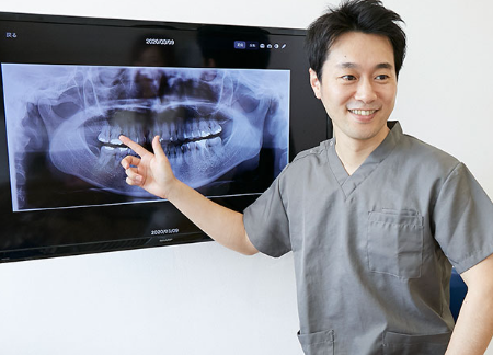診療内容は、虫歯治療、歯周病治療、予防歯科、小児歯科です。痛みに配慮した治療を重視し、麻酔の使い方や、リラックスできる雰囲気作りにも力を入れているそうです。また、歯と神経を残す治療に注力しており、将来的な歯の健康を考えた診療を行っています。治療前には、レントゲン撮影によるお口全体のチェックを実施。丁寧な説明を行い、患者様の納得を得てから治療を開始します。